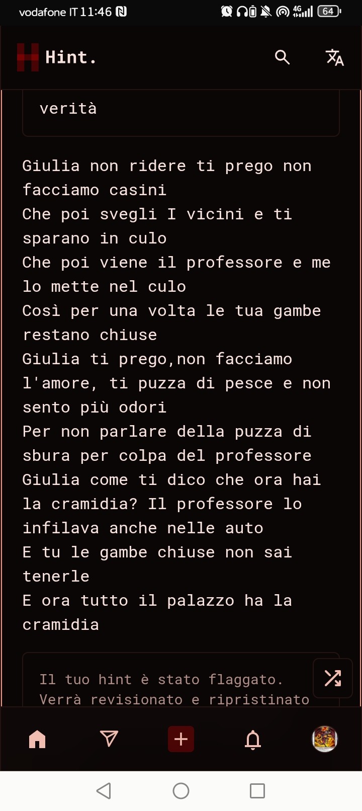 (dove cazzo son finiti, in genere alle 11 e 30 già pubblicava)Damn, non sono più abituata a mangiare, son già piena... Chi vuole finirla?