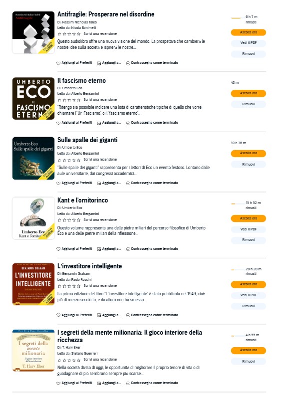 Il primo è di Taleb che dopo 12 ore di ascolto mi ha rotto il hahaha. Ha fatto 5000 esempi sullo stesso identico concetto. Belli, per carità, ma basta. Lo ritengo finito hahaha.Poi c'è Umberto Eco... primo capitolo, non ho capito come parla hahaha. Ha un modo di esprimersi troppo colto, capisco di più la divina commedia in confronto ad Umberto.