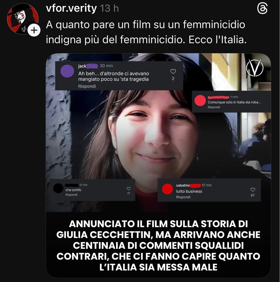 Comunque non ho mai viso una tragedia “pubblicizzata così tanto”. Me va per il rispetto di Giulia, non la commemora, il contrario…