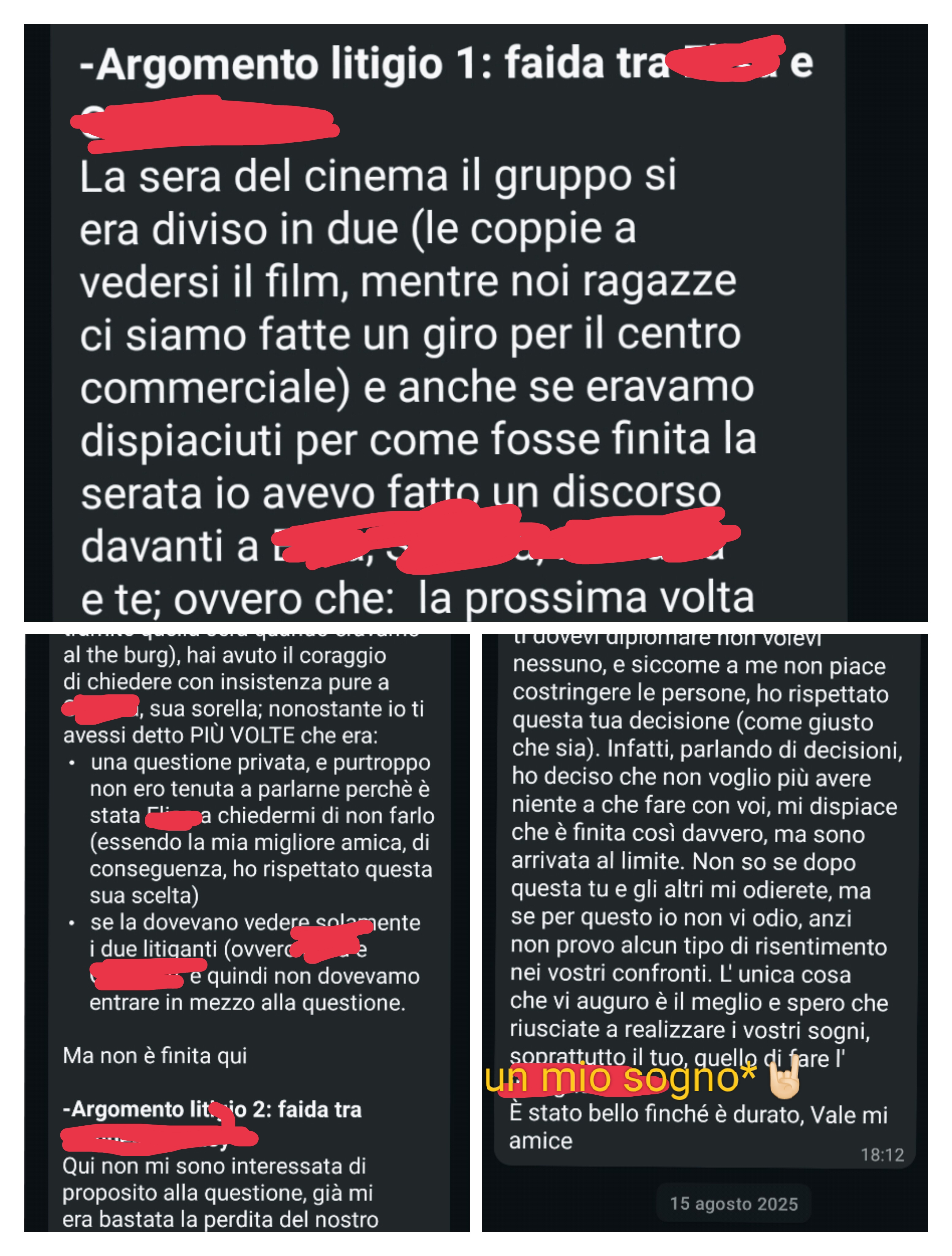1)Messaggio accusatorio scritto palesemente con Chatgpt, in cui VERA* mi accusava di aver insistito (io, che ero la più paziente del gruppo) su un "gossip" nel quale non mi sarei dovuta impicciare (fu lei stessa la prima a parlarmene con tanto di messaggi inoltrati🤨) con quella che credevo mia amica ("credevo" perché fu proprio quest'ultima, SONIA*, a mostrare miei messaggi senza contesto);